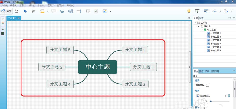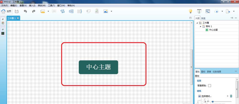 3、这时,会在XMind7生成一个“工作薄1”,中心还有个“中心主题”,如下图所示: