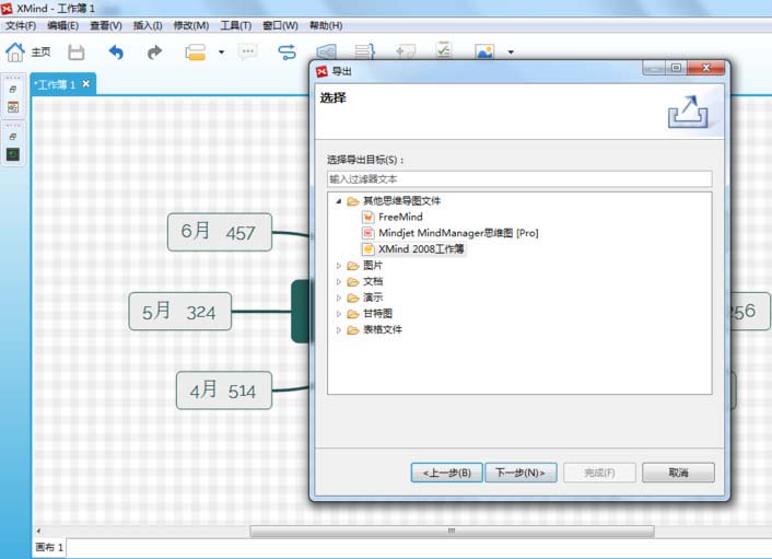 6、完成后,将其导出。选择“文件--->导出”,选择导出目标,这里选择了“XMind 2008工作薄”,如下图所示: