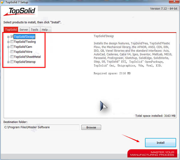 4.进入安装向导后,功能组件直接默认勾上即可,在选择安装位置,默认路径为“CC:\Program Files \Missler software”最后点击“install”