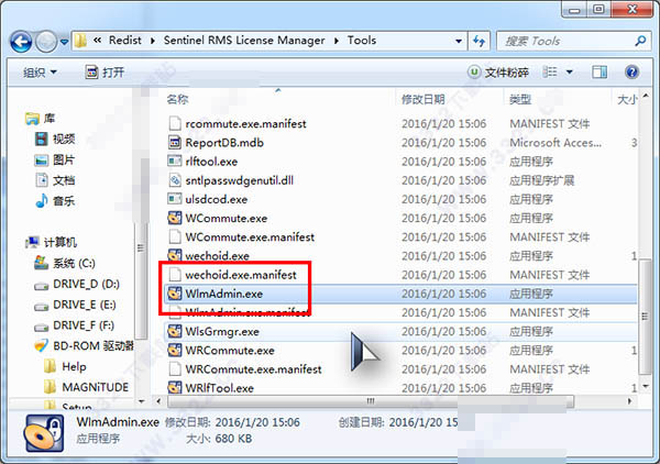 1.安装完成后先不要启动软件,打开虚拟光驱中的文件,进入\Setup\Redist\Sentinel RMS License Manager\Tools目录,运行“WlmAdmin.exe”。