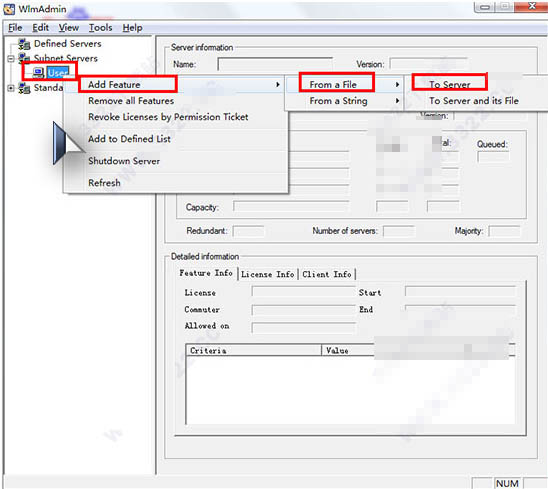 2.接着将注册机放在软件的安装目录中,启动wlmadmin在“subnet servers”中的“User”中选择Add Feature-From a File-To Server amd its File即可