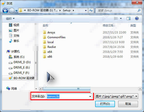 3.随后便会弹出要求提供lservrc.lic文件的位置,在弹出的对话窗口中选择打开即可。