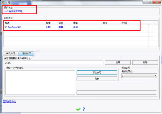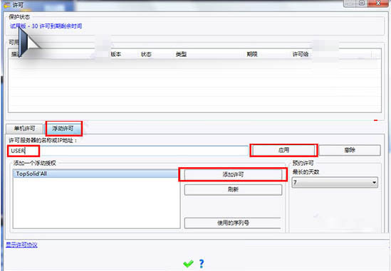 4.随后我们回到桌面鼠标双击“TopSolid 2018”的快捷图标打开,在许可窗口中输入注册的服务器名称“USER”,点击应用,然后选择许可点击添加。