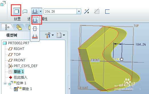2、拉伸成不封闭曲面。选择“拉伸为曲面”按钮,下图第一个红色框;拉伸方式选择第一项“从草绘平面以指定的深度值拉伸”,下图第二个红色框。深度值根据需要输入即可。