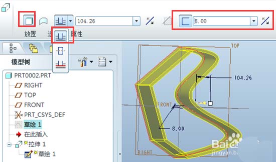 5、拉伸成一定壁厚的实体。选择“拉伸为实体”按钮,下图第一个红色框;拉伸方式选择第一项“从草绘平面以指定的深度值拉伸”,下图第二个红色框,深度值根据需要输入即可;输入实体的厚度,注意拉伸和厚度的方向,结果如下图。