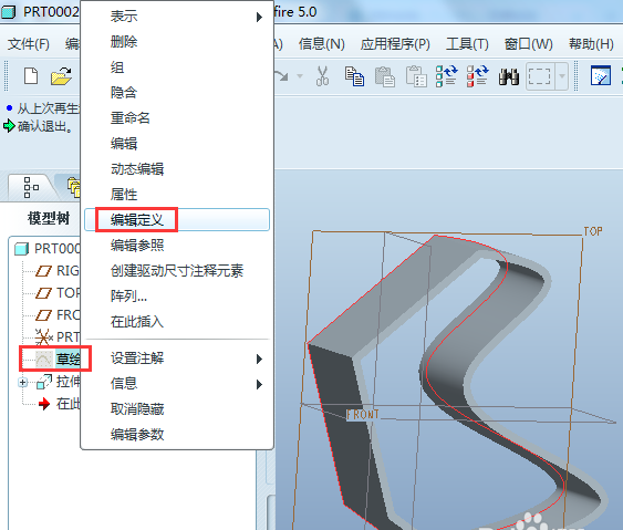 7、修改拉伸。在模型树中的“拉伸1”单击右键,弹出框中选择“编辑定义”,即可进入拉伸的编辑界面,对拉伸进行修改。