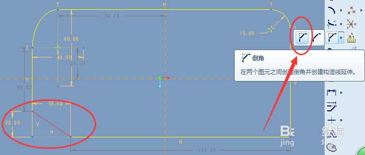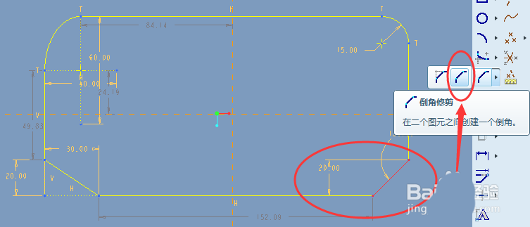 5、倒角修剪。倒角修剪的操作方法如下图,尺寸仅供参考,其与第4步的区别在于倒角后不保留构造线。