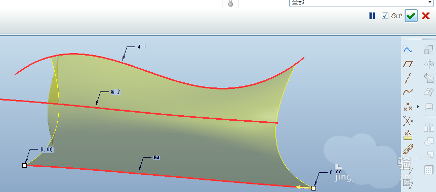 2、在Top基准面上草绘如下图1的样条曲线,最终形成的三条扫描轨迹线如下图2所示。