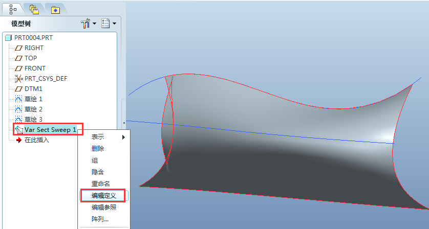 7、若要修改该特征,只需右键点击模型树的“var sect sweep”,或者右键单击扫描形成的特征,弹出框选择“编辑定义”,即可进入控制面板,修改相应项即可。