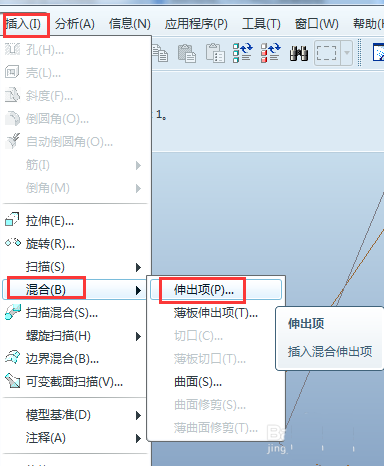1、新建零件,然后依次点击“插入”-“混合”-“伸出项”。