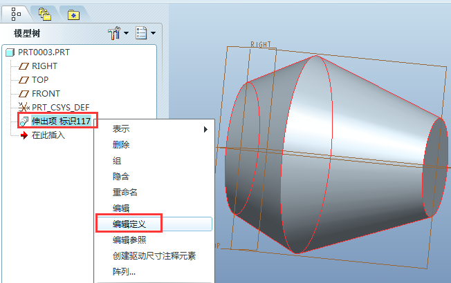 9、最终效果如下,若要修改该混合特征,只需右键点击模型树的“伸出项”,弹出框选择“编辑定义,即可进入第三步的混合特征窗口,修改相应项即可。