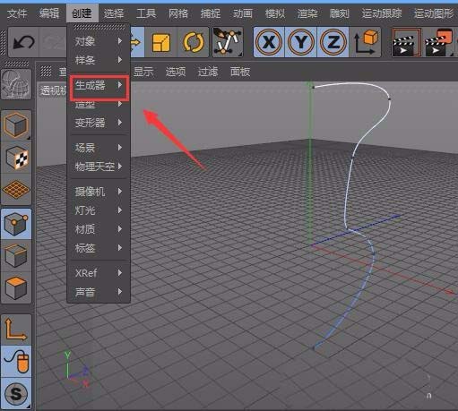 5、绘制好贝塞尔样条线之后我们在菜单里找到创建选项,点击该选项在其子级菜单里找到生成器选项,如图所示: