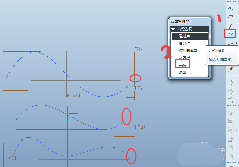 5、点击工具栏的“基准曲线”按钮,选择三条草绘曲线的端点创建基准曲线。