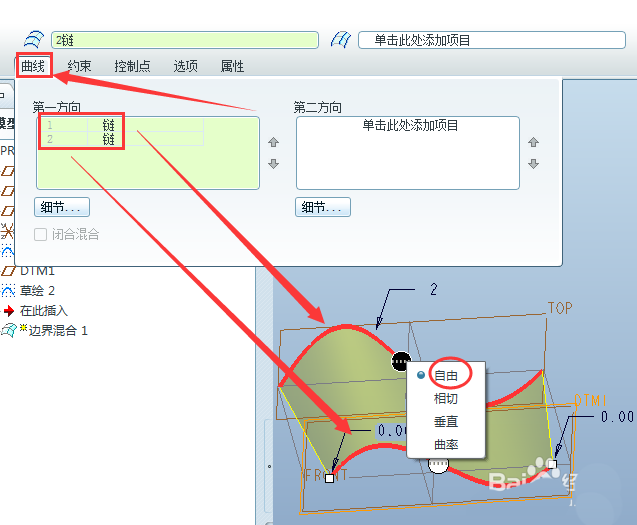 5、系统弹出如下“边界混合”的操控面板,点击“曲线”,按Ctrl拾取两条曲线,点击“约束”或者右键点击曲线上的圆圈,可对曲面的起始和终端进行约束如自由、相切、曲率、垂直等,我们选取默认值自由,其它几种形式大家可以自行尝试。预览效果如下,点击√完成。