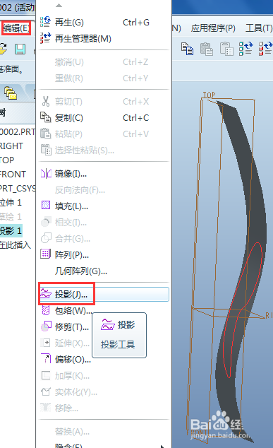 2、选择曲面上的曲线,依次点击“编辑”-“投影”。