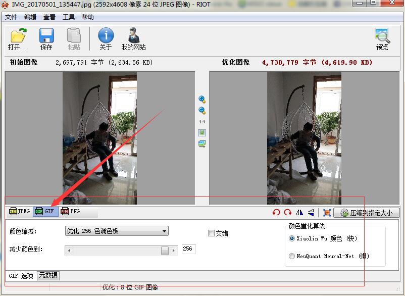 4、单击GIF,可以设置颜色缩减、优化调色板