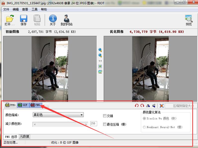 中行说图像优化器是一款图片压缩的软件,该软件与一般的压缩软件不一样,通常压缩软件使用的都是直接减小图片的体积大小,不能保证图片失真的情况,这款软件采用减少颜色、优化调色板、设置量化算法的方式,从图片的根本上减小压缩的体积,相当于将图片从原始的状态开始压缩,极大的保证了压缩过程中不会损坏任何参数,同时可以将图片压缩到指定大小,输入您需要的数值就可以更改了,非常方便,本软件支持PNG、JPEG、GIF图片,需要的朋友可以下载试试!