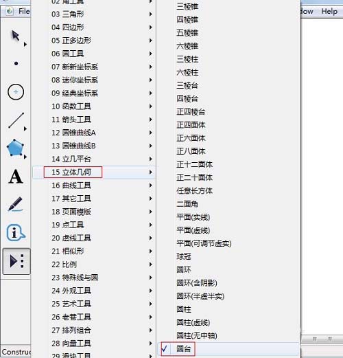 1、打开几何画板数学课件制作工具,单击侧边栏“自定义工具”——“立体几何”——圆台。