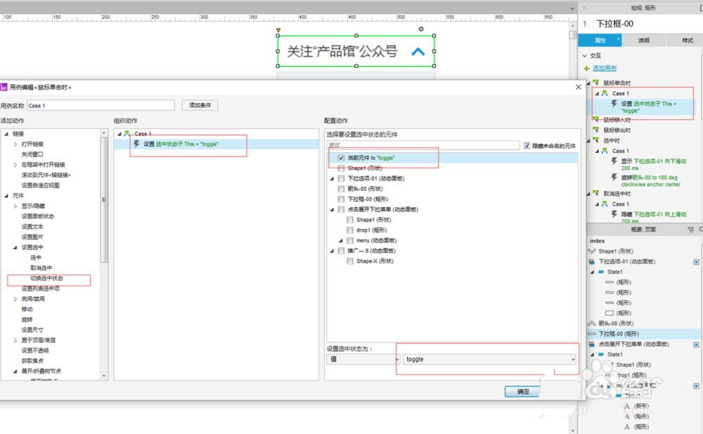 7、到这里基本就差不多了,最后,把下拉选项动态面板隐藏。