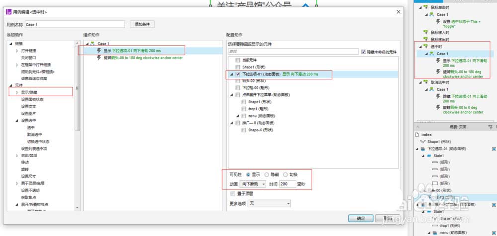 2)设置选中时的样式和状态:显示下拉选项面板+箭头向下(这里建议用绝对值),同样的方法,设置下拉菜单的取消选中时的状态样式。
