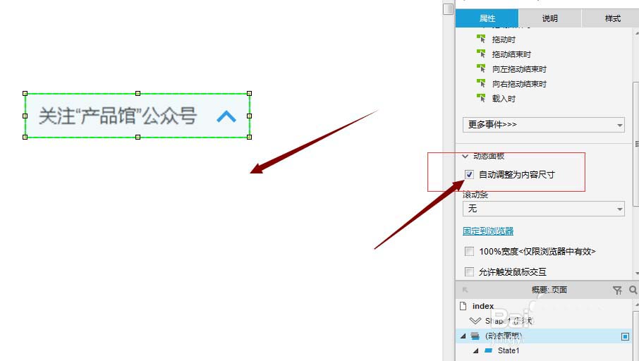 8、再把这个组件设为动态面板,然后勾选“自动调整为内容尺寸”,这样的好处时隐藏掉的部分,不再占用空间,更有利于原型的排版。但是有一点,这样做的话,显示隐藏时的推拉组件功能会对动态面板外的组件失效。