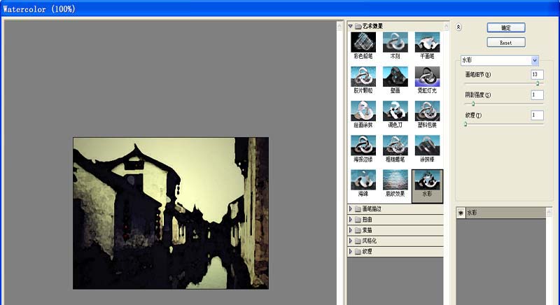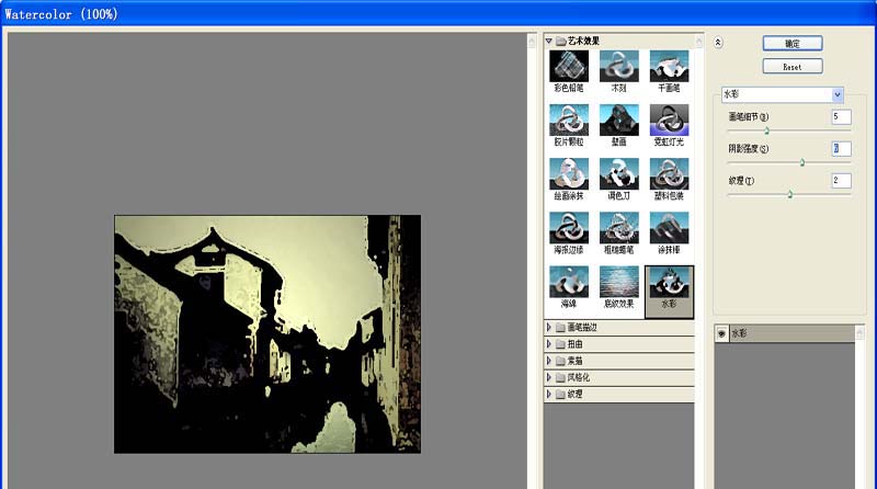 2、点击右边的ps特效选项,从中选择水彩选项,调出水彩对话框。