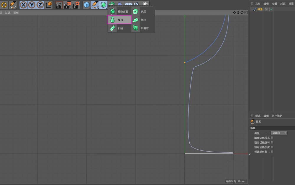 6、新建【旋转】工具,作为样条的父级