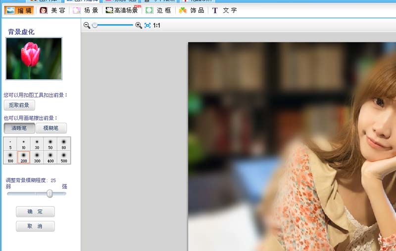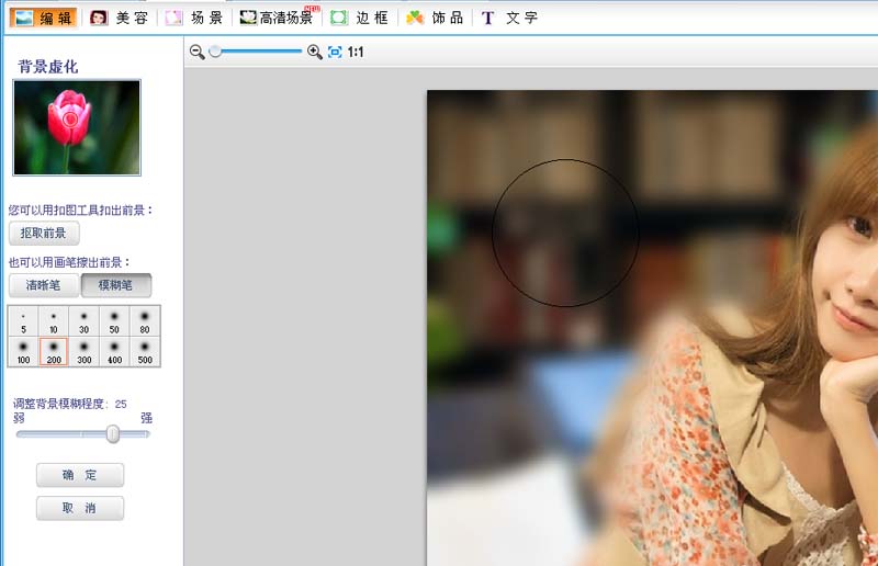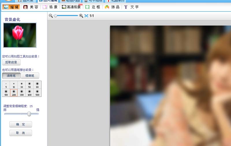4、接着选择模糊笔,在除了人物之外的地方进行涂抹,将背景进行虚化。