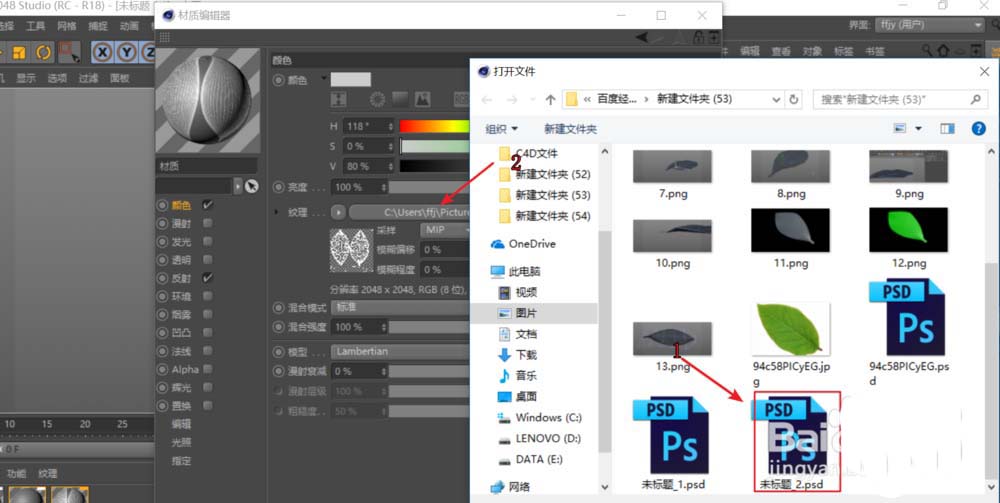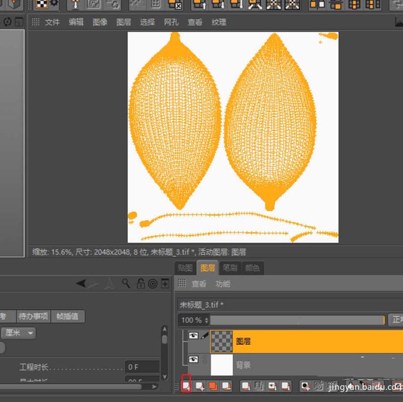 6、回到C4D建模界面,将刚保存得到的纹理拖到材质栏,软件自动建立一新的材质并在颜色通道加载了纹理进去。