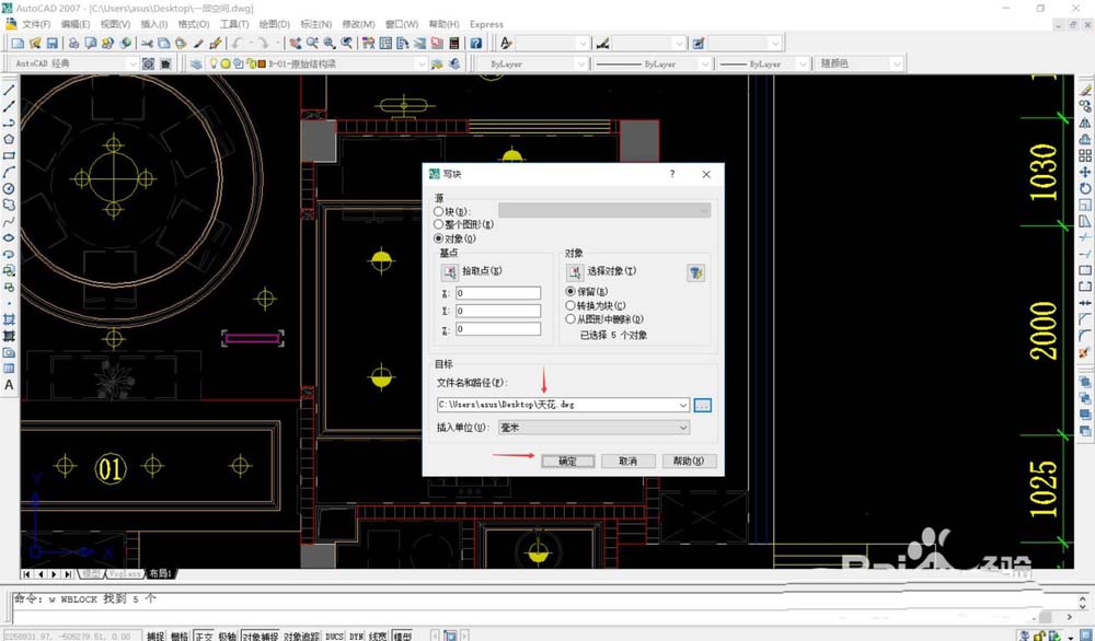 2、将红色图框中的吊顶边框和线条选中,W(建外部块),回车,在弹出的对话框中命名“天花”,保存在桌面上,单击“保存”、“确定”,即相当于新建了一个独立的文件。