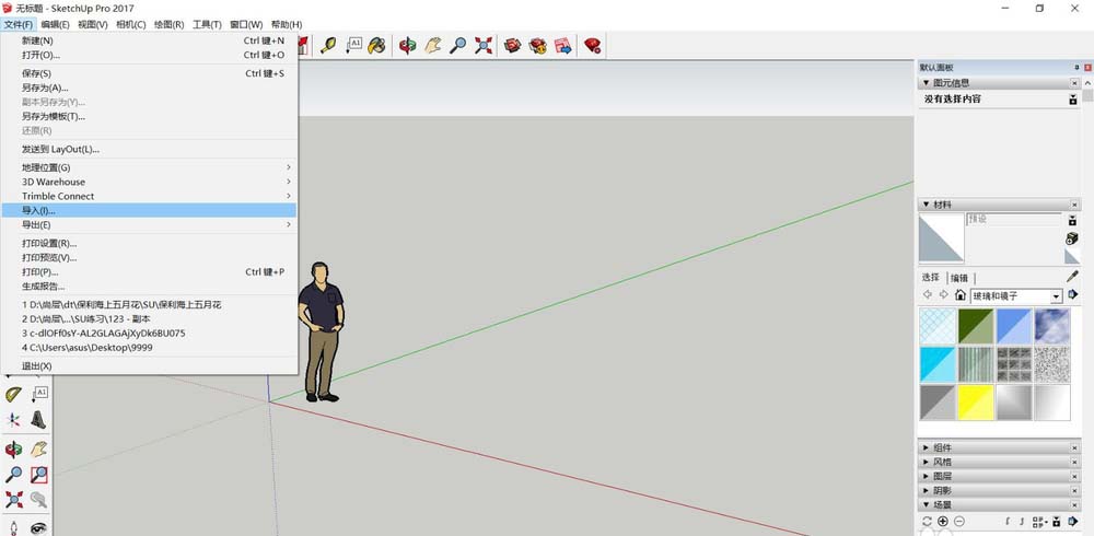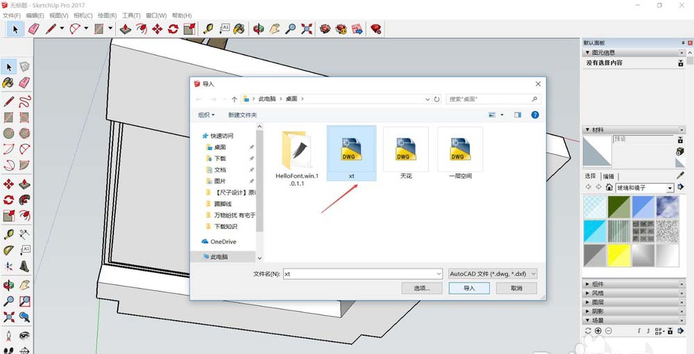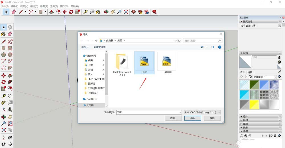3、打开SU文件,“文件”—“导入”,在弹出的对话框中选桌面上的“天花”,“导入”。