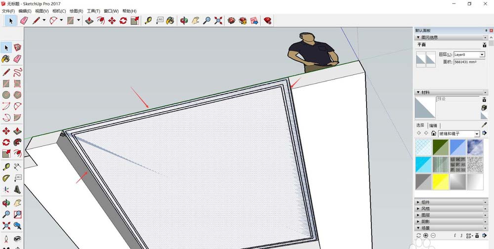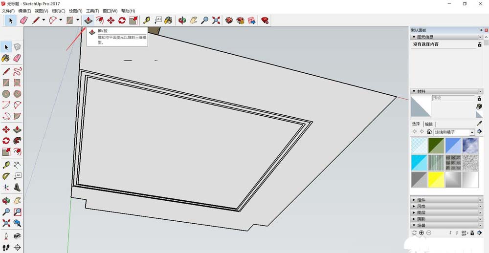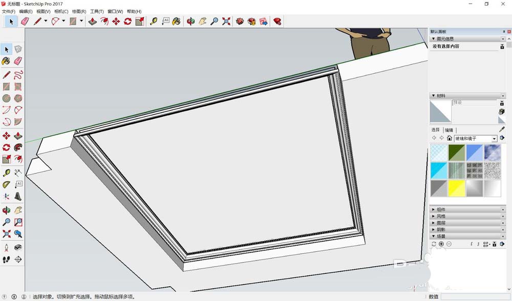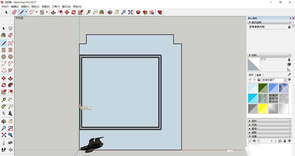 4、导入的文件会自动成为一个组,选择直线或者矩形工具,围着吊顶边线和线条边线描线,线条部分只描外部边框即可,后面会教大家怎么贴线条。