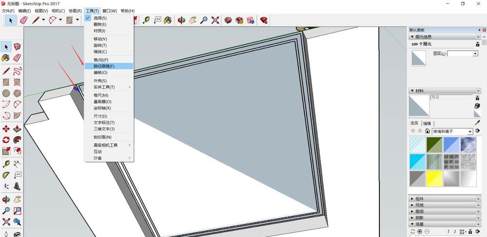 9、“工具”—“路径跟随”,鼠标移动到线条样式2上,再移动到上一步所描的线上并推进,可以看到线条样式已经跟随路径形成了。