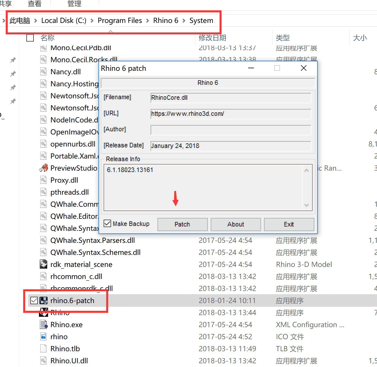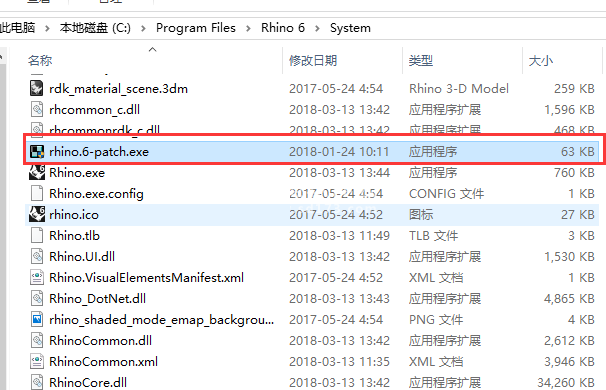 6、安装完成后不要运行,我们开始进行破解操作,将安装包中rhino.6-patch.exe复制到安装目录中的system文件夹中,如图所示
