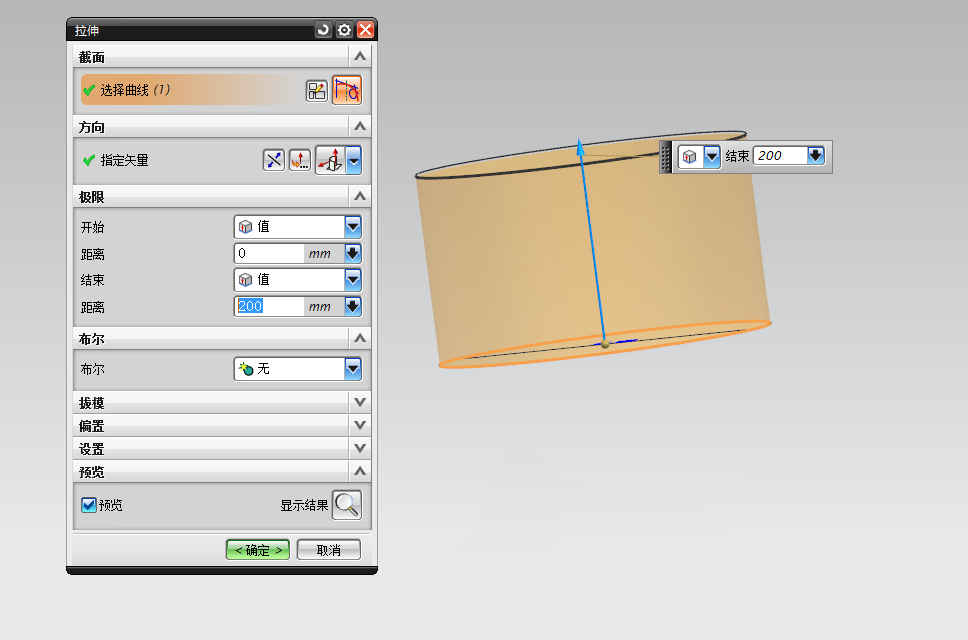 2、退出草图,点击拉伸,把圆形先拉伸成一个圆柱体,高度设置为200。