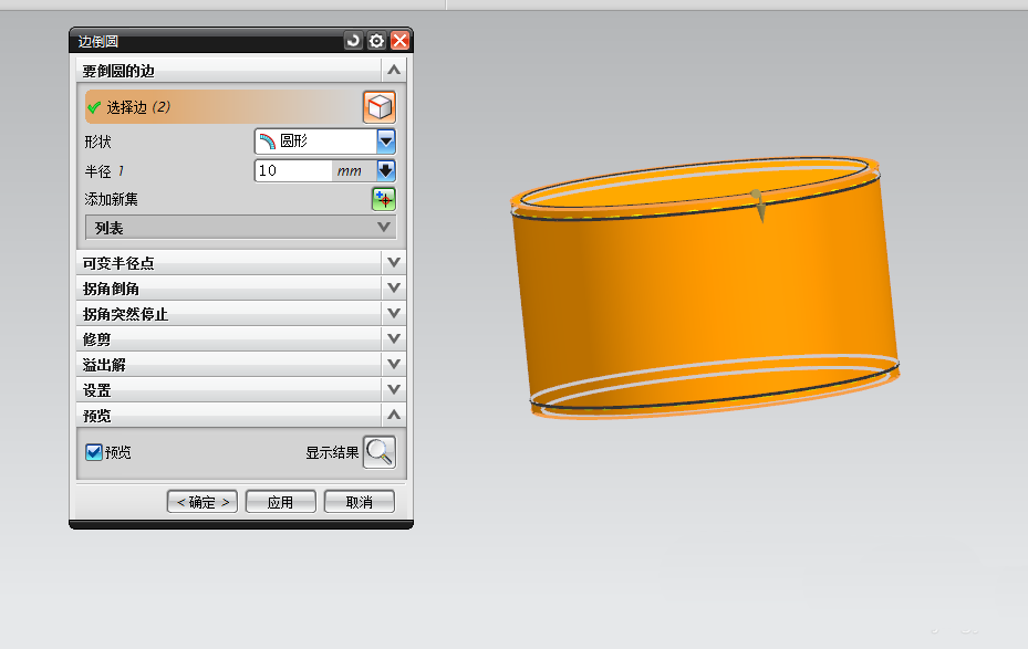 4、点击【边倒圆】,选择要倒圆角的边,这里我们选择上、下两条边,设置倒圆角的半径为10即可。