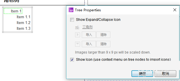 5、右键菜单,选择第四个,编辑图标按钮,点击导入,导入需要的图片,根据需要选择需要应用的情况,同级节点还是当前节点等,点击确定,出现图标。