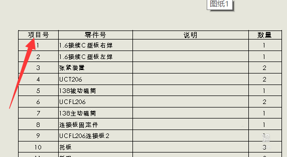 4、然后先点击一下工程图里面的草图,生成一个明细表,可以看到默认的是目录在明细表上面