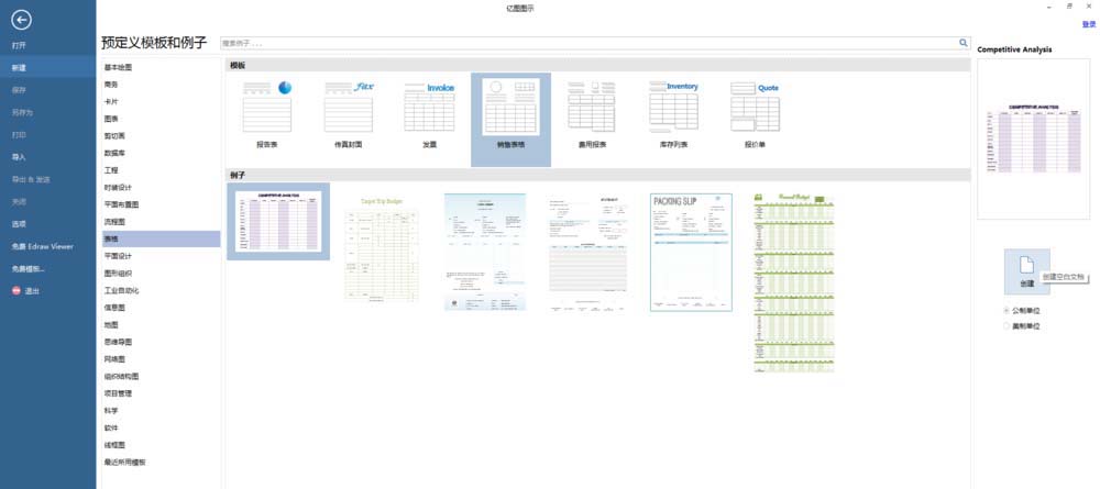 4、点击【表格】,在模板下点击【销售表格】,在例子下点击第二个模板例子,然后在右侧点击【创建】