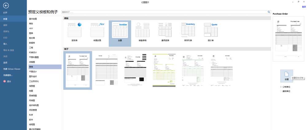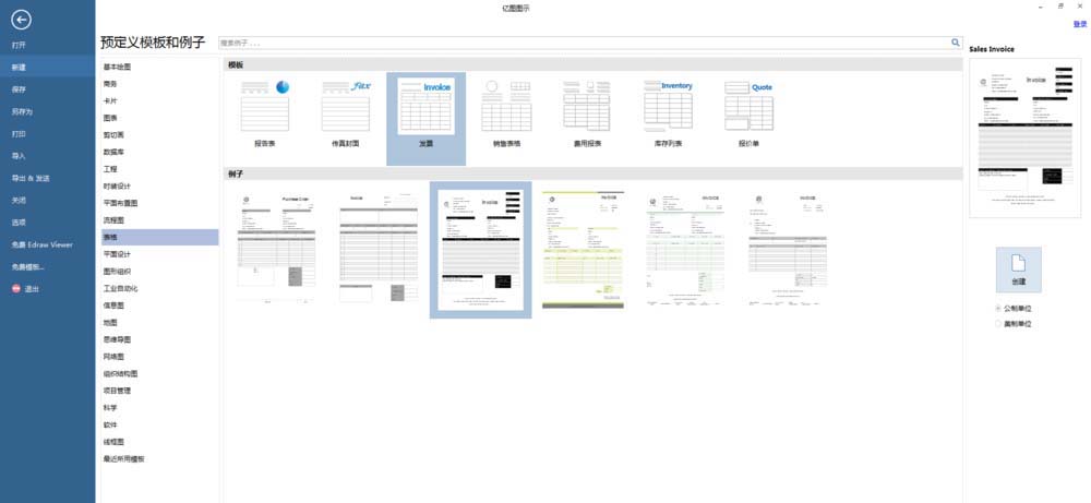 4、点击【表格】,在模板下点击【发票】,在例子下点击第二个模板例子,然后在右侧点击【创建】