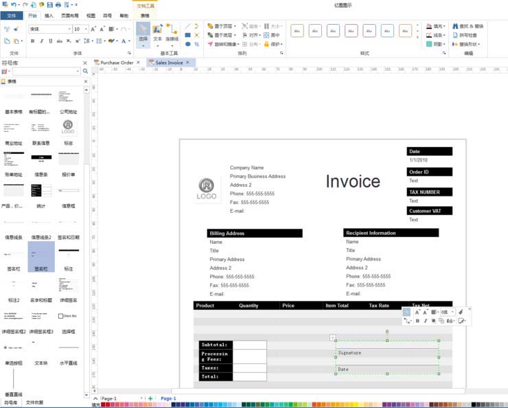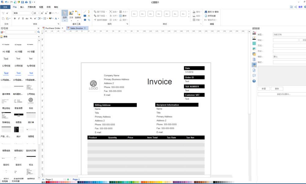 6、从左侧拖动对象到主窗口,添加更多的发票元素,以形成最终的发票