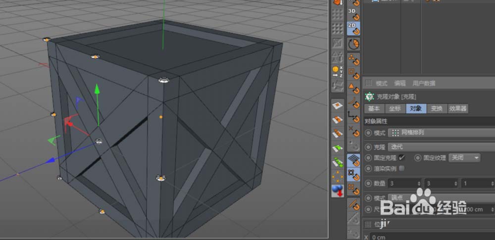 5、对刚创建的钉头添加克隆,方式为网格排列(具体参数如图1),在克隆属性选项中,调整相应的参数,使对象的位置及方向刚好贴在箱子的梁面上。