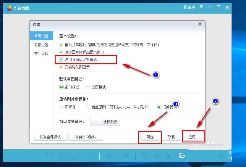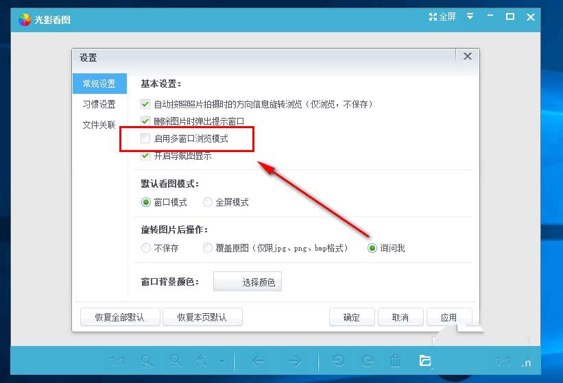 5、勾选“启用多窗口浏览模式”,然后点击右下角的“应用”,然后点击“确定”