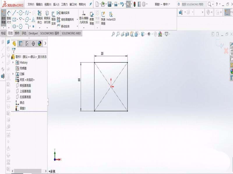 3、新建草图,绘制一个长宽为20mm的正方形。