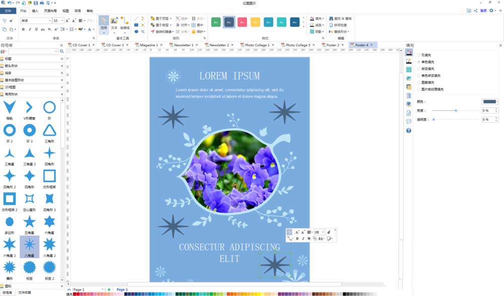 6、从左侧拖动对象到主窗口,添加更多的海报元素,以形成最终的海报