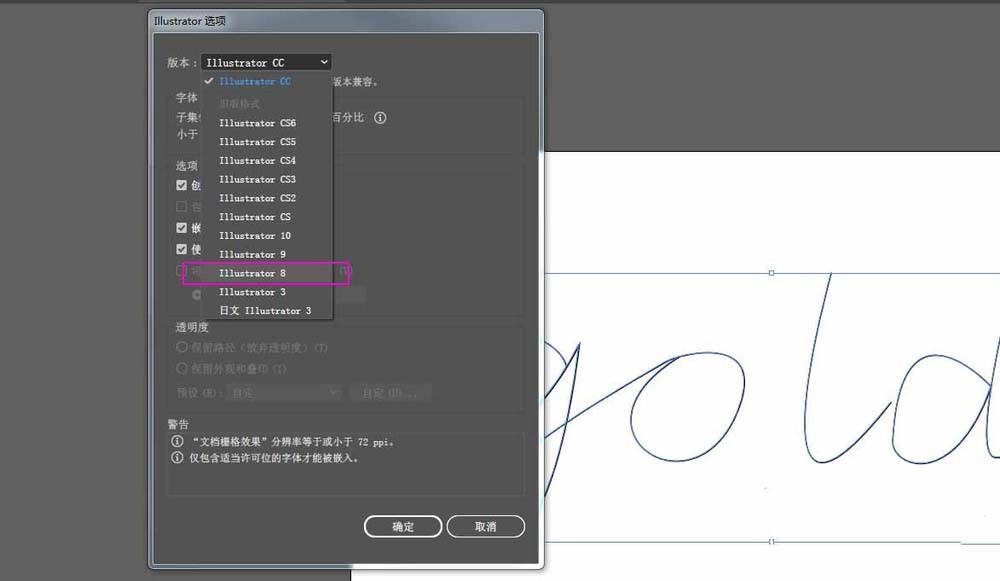 2、另存时版本选择Illustrator8,这是C4D唯一可识别的版本。