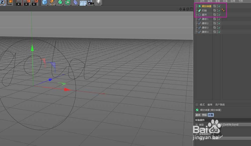 5、新建【细分曲面】【扫描】【圆环】三个对象