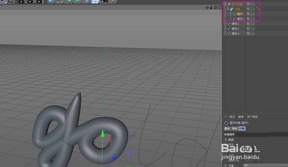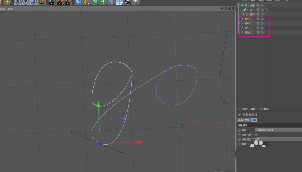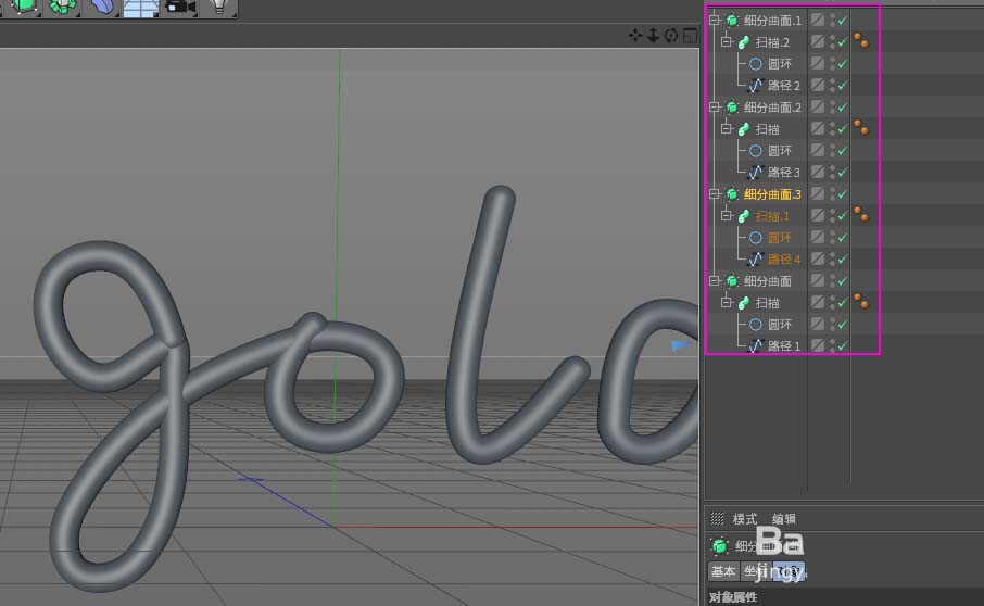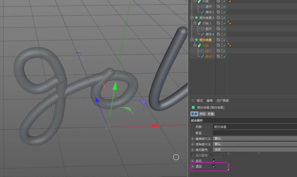 10、找出连笔路径,选中细分曲面,在面板的基本属性中勾选“透显”(如果扫描效果无需调整,则以下几步操作可以不进行)