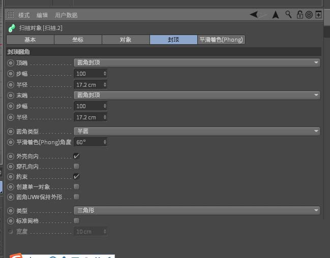 7、调整扫描对象的封顶属性,使起点和终点圆滑,并勾选“约束”