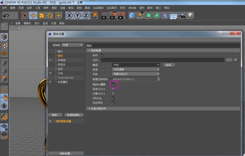 13、在渲染设置的“保存”选项中,格式选“PNG”,勾选“Alpha通道”